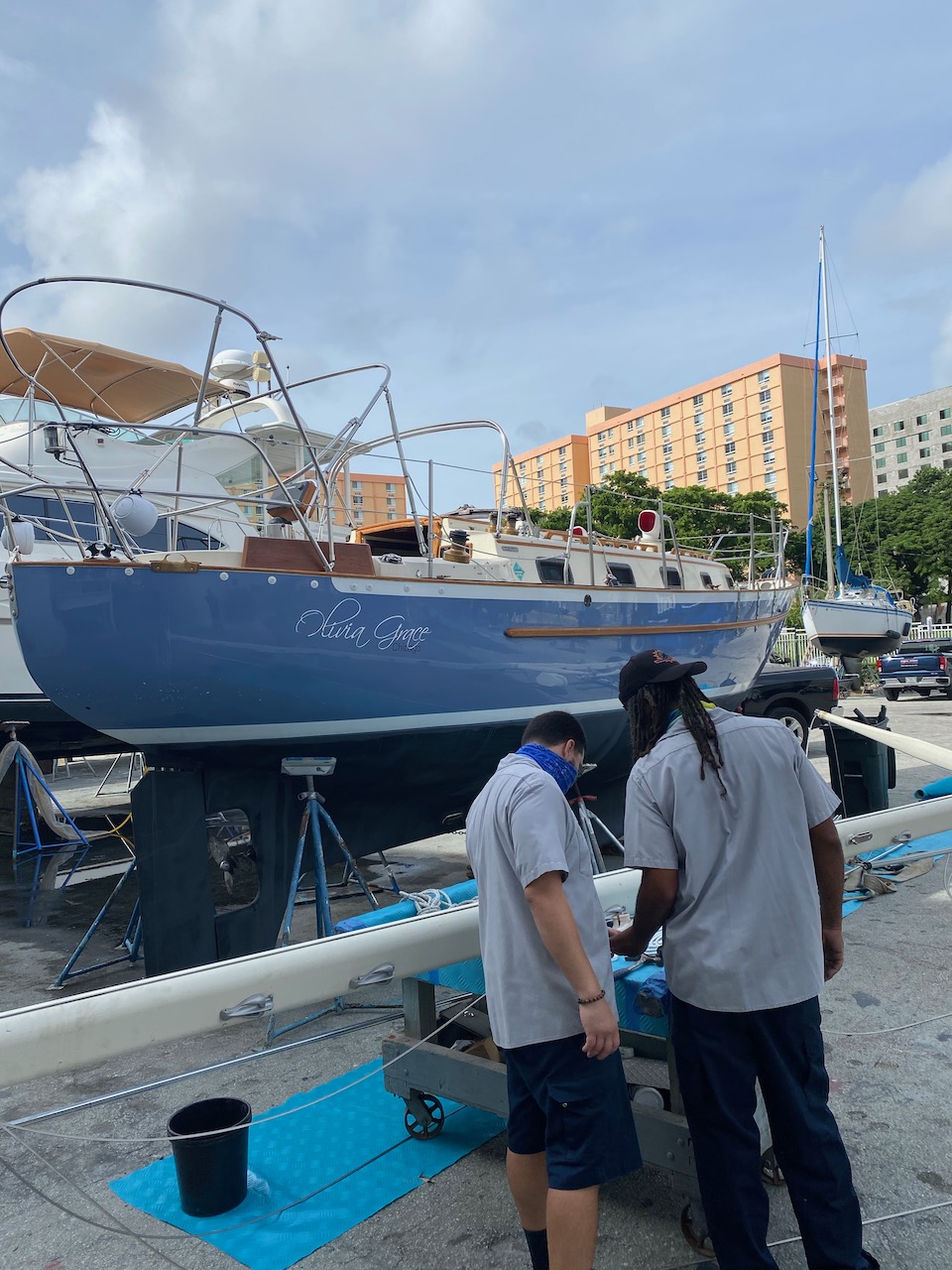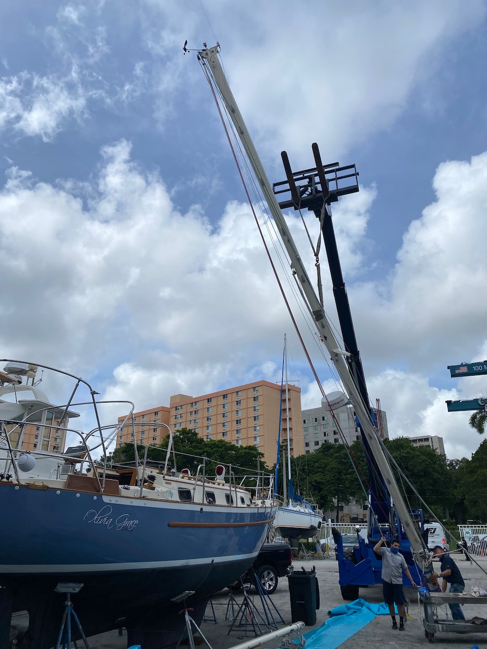 For the next three days, I “lived” at the Miami boatyard. I worked 12-hour days, unpacking and reassembling the boat, tuning the new rigging and reinstalling sails—breaking only for some form of Cuban lunché, which will be sorely missed once back home. After a full day in the yard, I would return to quarantine at Springhill Suites, just across the river, to order takeout and work on payroll. Back at the yard, I tested all of the OG’s major systems and all of its through-hull fittings; I also recalibrated the navigational system and sprayed for bugs. This final task was critical, given that the boat would sit unused and in the tropics until a date uncertain. We don’t need any more “crew” on this ride.