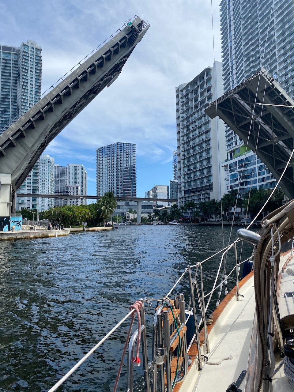 Finally, on October 8, two days after Eddie Van Halen died of throat cancer—significant because Van Halen had been blaring from the radio non-stop for days—the OG was ready for departure. At 1pm, after the bridge operators’ noon siesta, the OG and I made our way through the first of nine bridges that govern the five mile stretch along the Miami River, between the boatyard and Miami Beach Marina.