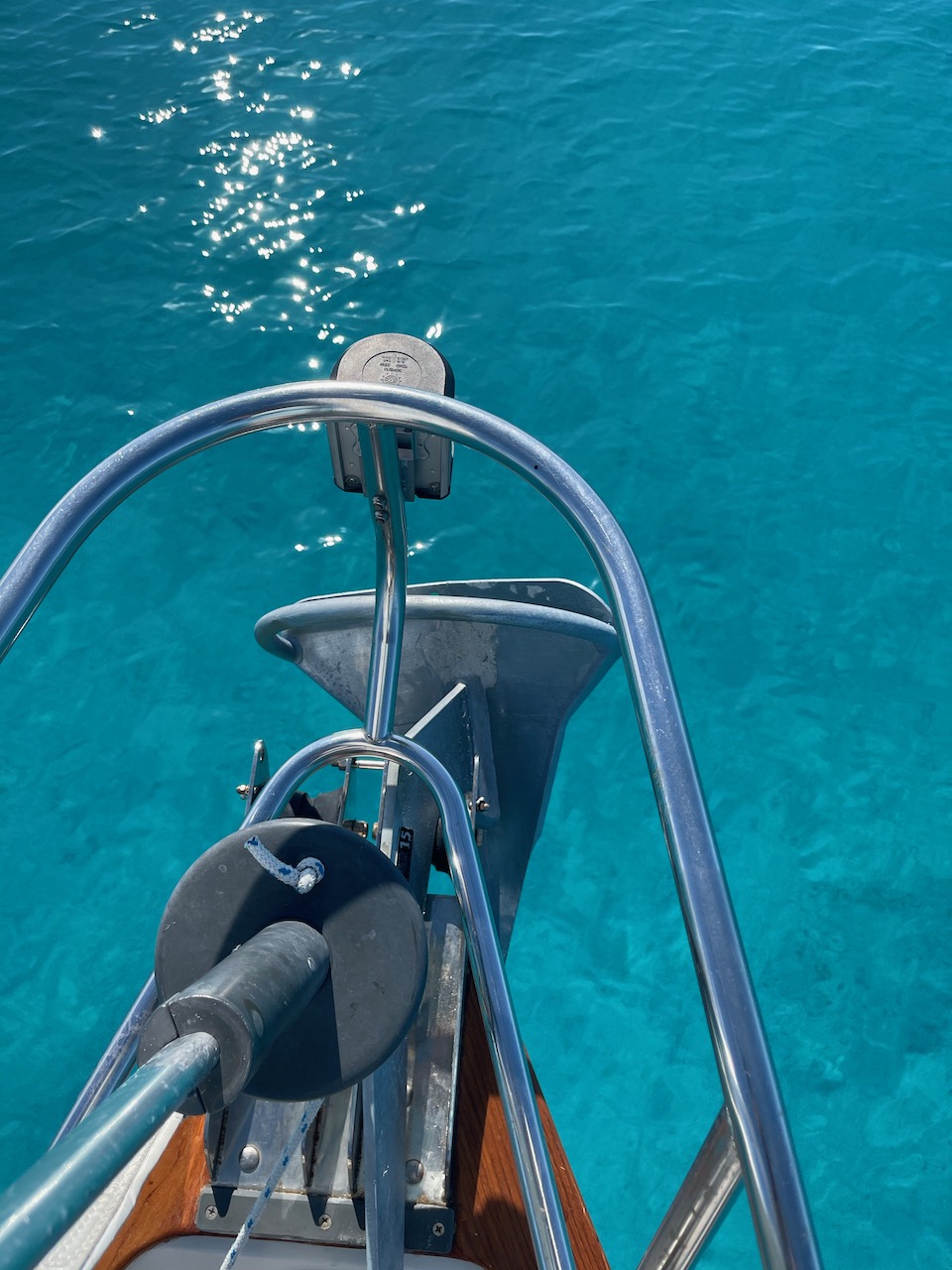 Once in deep water, we sailed another 15 nm eastward, in turquoise-blue water on a gentle broad reach. We finally anchored in Hatchet Bay just before sundown, ready for a celebratory drink and some conch fritters. Hatchet Bay is a well-protected anchorage, with a 30-foot unmarked entrance, carved into granite rock.