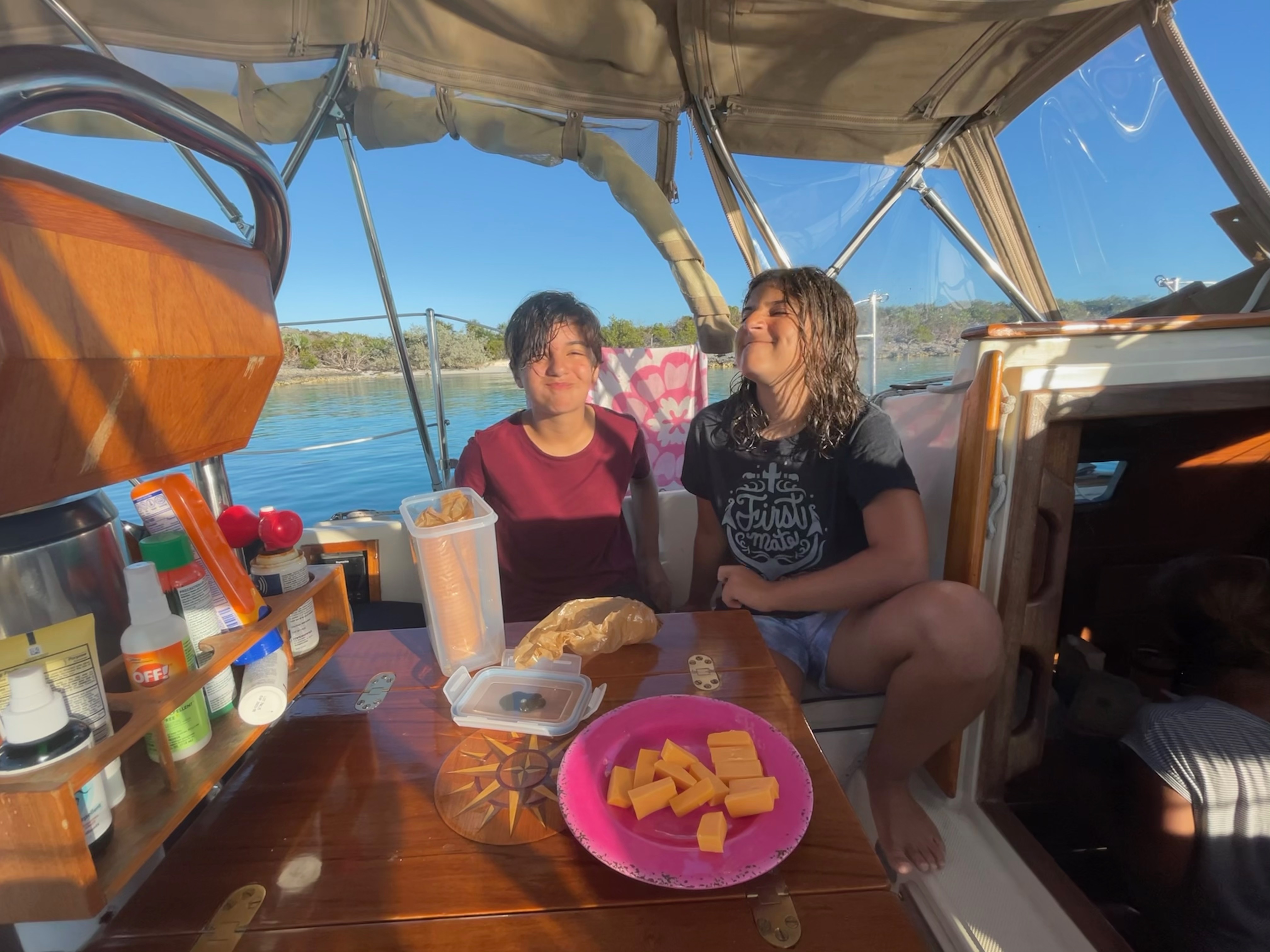 Compass is also known for its school of tame nurse sharks. The kids wasted no time and jumped right in. Swimming among the 5-6’ sharks, they also met Mackenzie, an 11-year old from Maryland out cruising with her parents. . . one more reason we decided to stick around Compass.